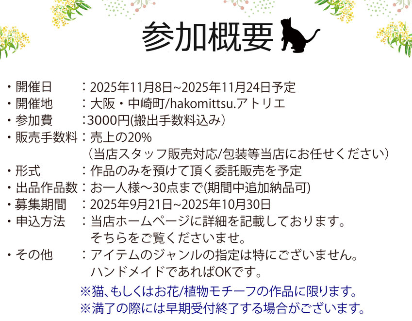 猫、もしくは、お花/植物をモチーフとしたハンドメイド作品であればアイテムは問いません。